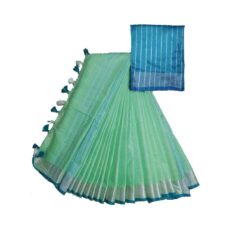 Daulas | Women’s Handloom Linen Cotton Blend Bhagalpuri Saree With Zari Border and Striped Blouse Piece_Free Size (11997 Silver-Light Green-Cyan)