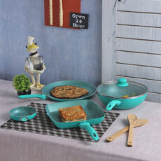 Celebration Non-stick Cookware Set, 5Pc (Wok with Lid, Mini Fry Pan, Dosa Tawa, Grill Pan), Induction Friendly, Soft Touch Handle, Pure Grade Aluminium, PFOA/Heavy Metals Free, 2.2mm, 2 Years Warranty, Turquoise blue