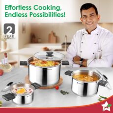 Click and Cook Stainless Steel Casserole 3 Pc Set | 6.5 L, 3.2 L, 1 L | Unique Foldable Cool-touch Handles | Tri-ply Bottom | Glass Lid with Steam Vent | Induction and Gas Cooktop Friendly