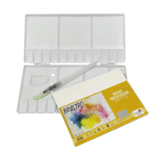 Brustro Folding Box 33 Well Plastic Palette 26×13 cm with Brustro Aqua Squeeze Brush Small and Brustro Watercolour Paper 200 GSM, 5″ X 7″