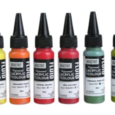 Brustro Professional Artists ’ Fluid Acrylic 20 ml High Chroma Set of 6 (Cad Orange,Cad Yellow Medium,Cad Red Medium,Cobalt Blue,Dioxazine Purple,Magenta Quinh Violet) with Pouring Medium 200 ml