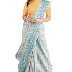 OISHANI SAREE GHOR Women’s Traditional Bengal Cotton Silk Belpata Jamdani Saree (White SkyBlue)