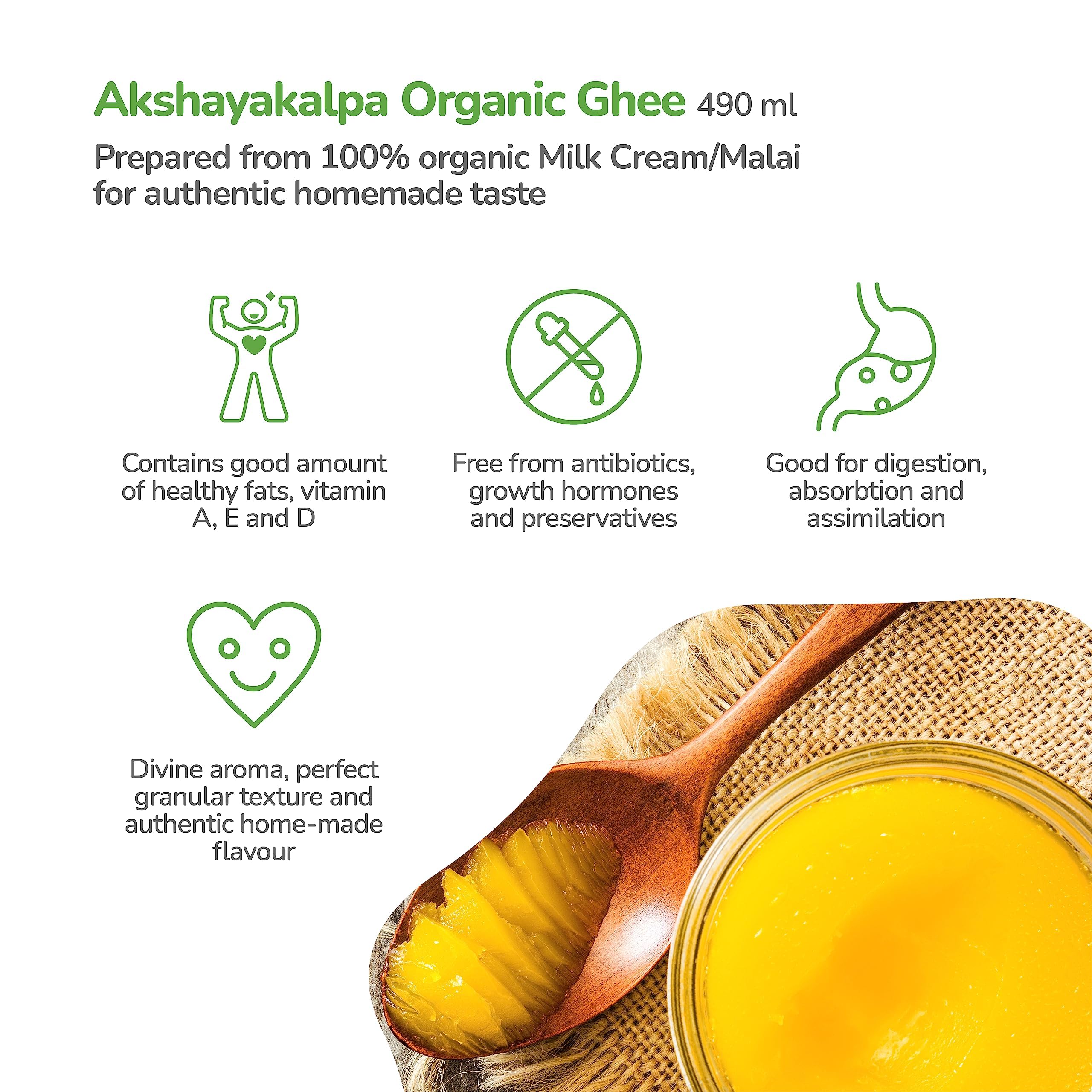 - Crafted from organic cow milk, Akshayakalpa Organic Cow Ghee follows the traditional intricacies of the heritage Bilona method. Organic milk fat is slow-churned into butter and carefully melted to give you ghee with unparalleled aroma, perfect granular texture and authentic home-made taste.