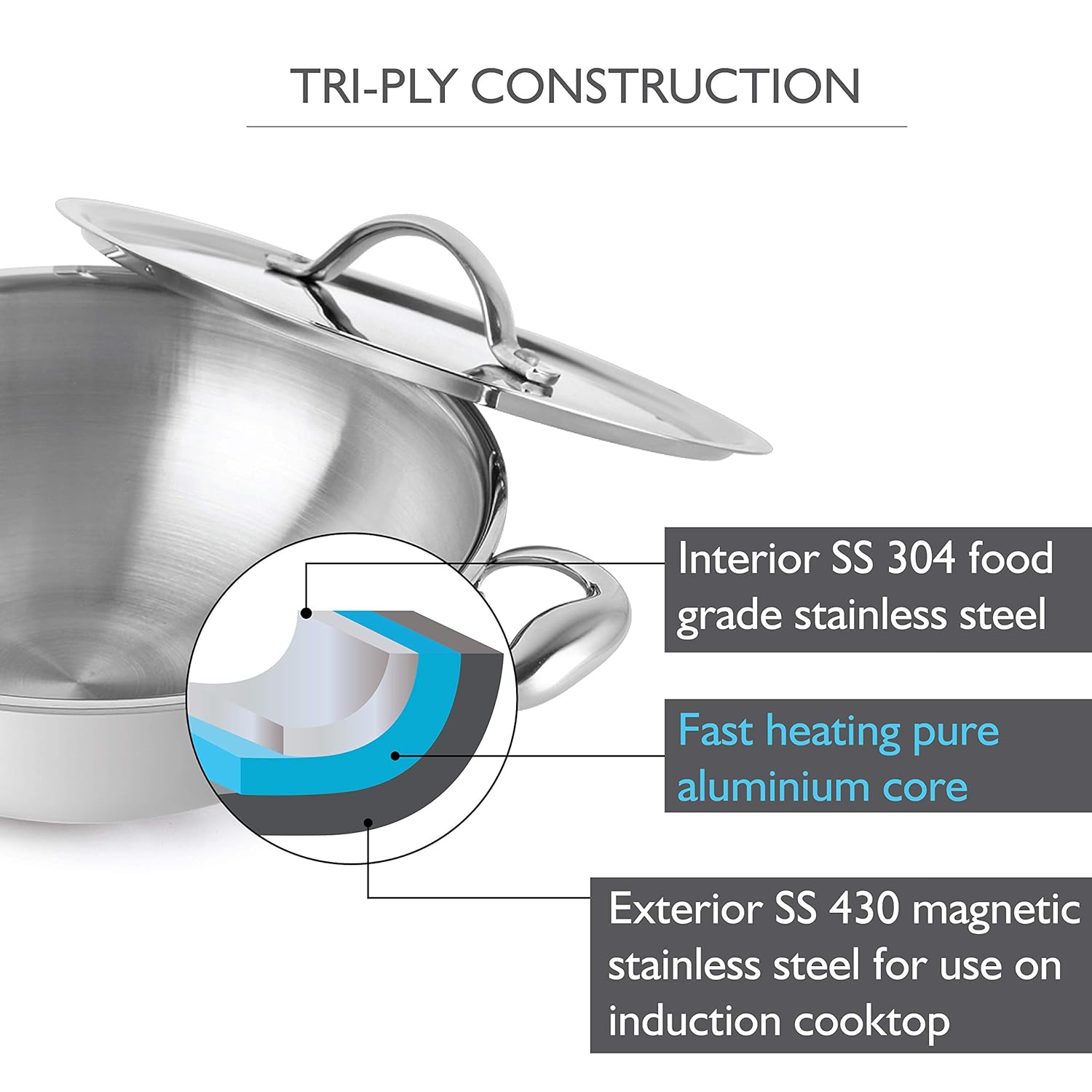 - Three Layers, Three Benefits: Core of quick and even heating Aluminium sandwiched between 2 layers of 100% safe non-toxic food grade Stainless Steel