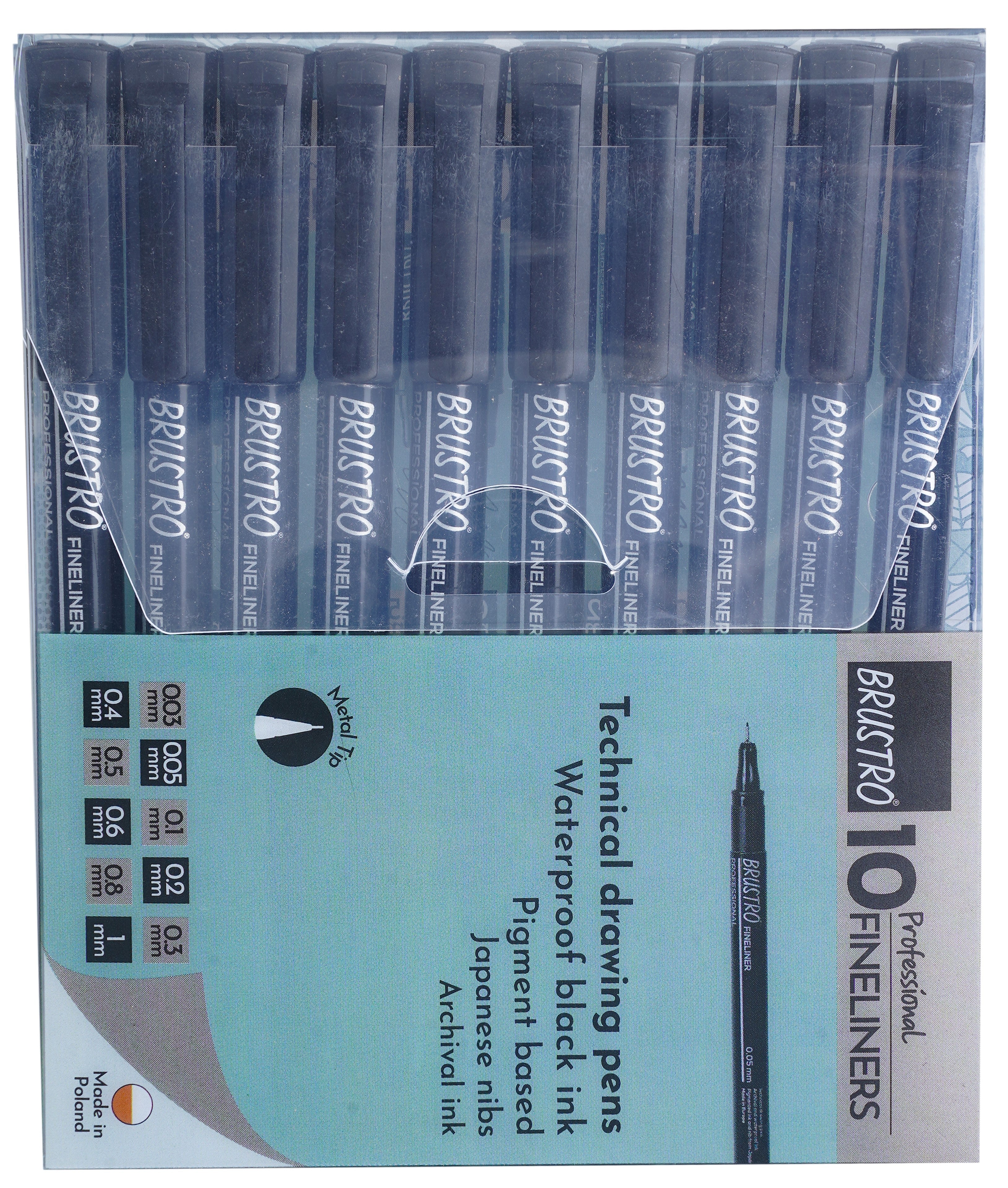 - This set contains 10 fineliners which include: 0.03/0.05/0.1/0.2/0.3/0,4/0.5/0.6/0.8/1 mm (in black ink) .