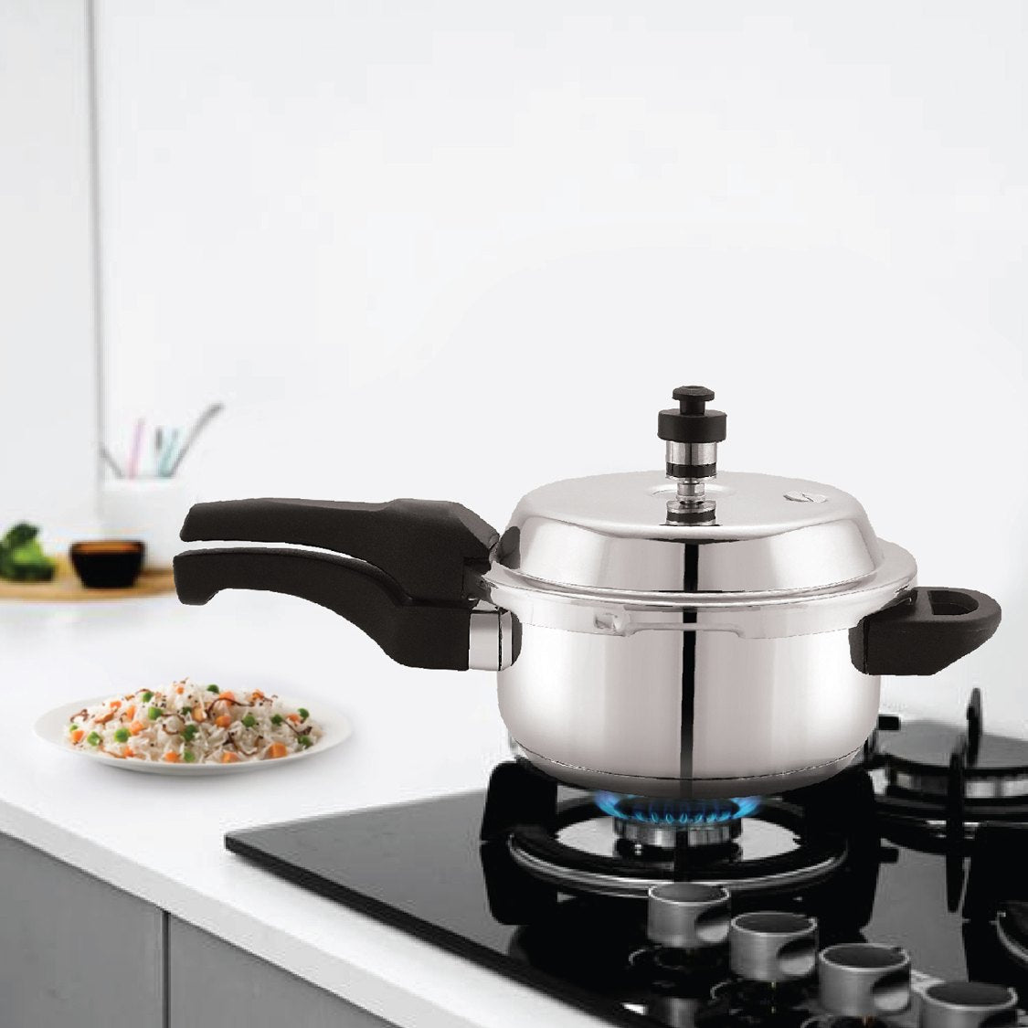 - Outer lid- The pressure cooker comes with an outer lid that incorporates essential safety features. It includes a steam vent to release excess steam, a safety valve to regulate pressure levels, and a silicon rubber gasket that creates a tight seal to maintain pressure and prevent leaks; available in 2 Litres, 3 Litres and 5 Litres, Colour – Silver
