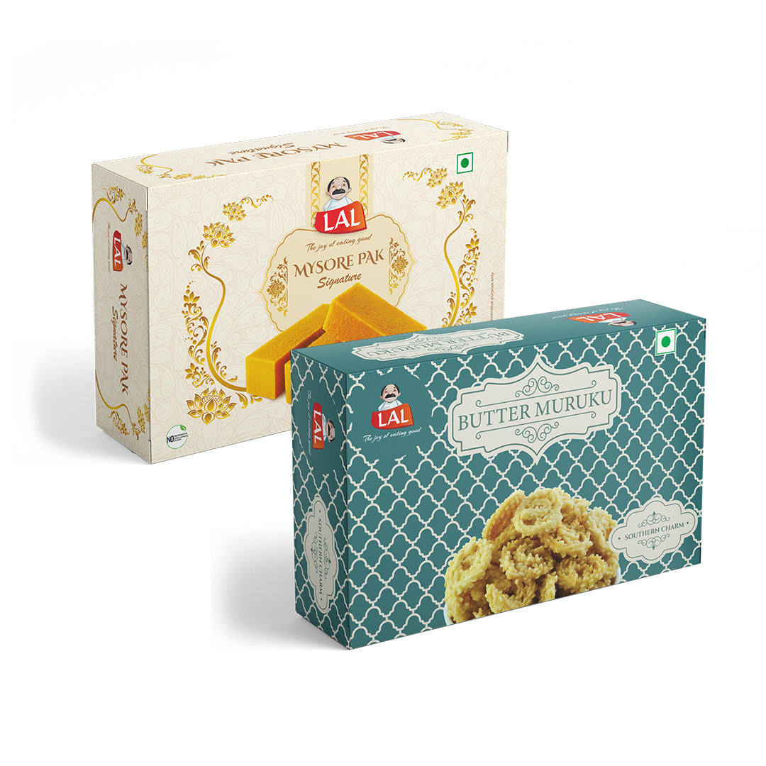 The crispy texture of Chakli Masala pairs perfectly with the rich, melt-in-your-mouth Mysore Pak, offering a balanced mix of crunchy and soft textures.