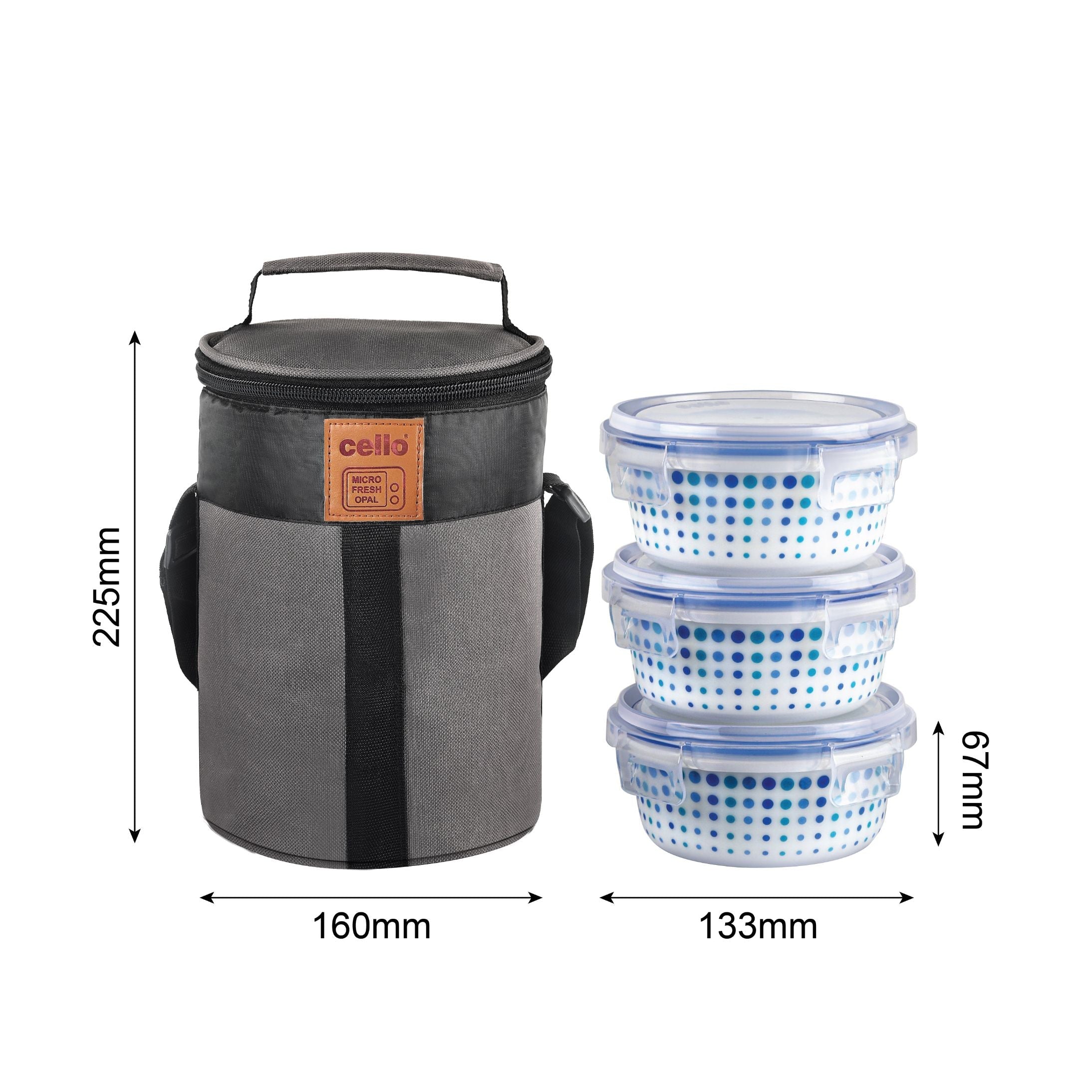 - Experience the versatility of the Cool Dots Opalware Lunch Box with Jacket, available in your choice of a 3-piece or 2-piece set.