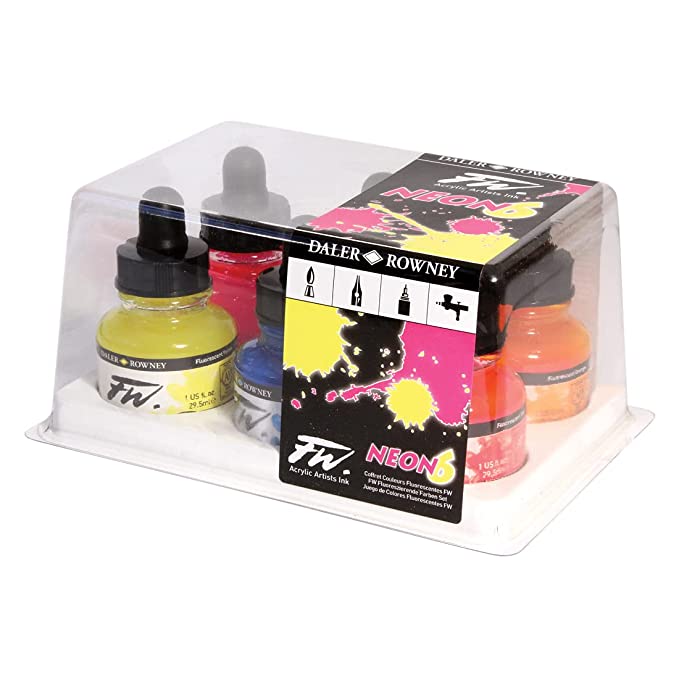 Daler-Rowney FW Mixed Media Paint Marker replacement nib sets are available in a variety of nib sizes matching the different marker head sizes. You will find a paint marker nib for each of your needs! Set of 6x 29.5ml bottles of FW Neon colours: Fluorescent Yellow,Fluorescent Orange,Fluorescent Red,Fluorescent Pink,Fluorescent Blue,Fluorescent Green.