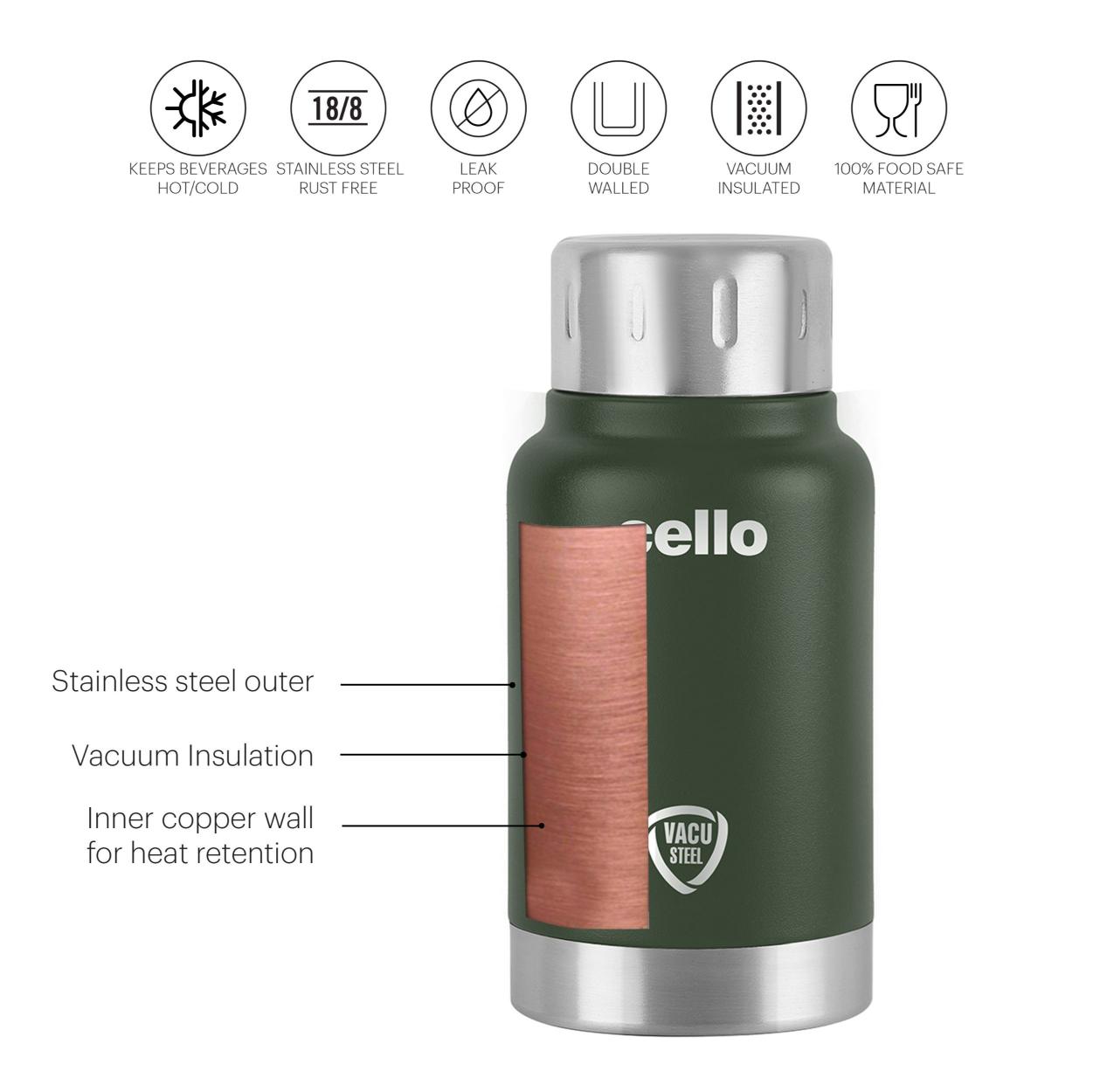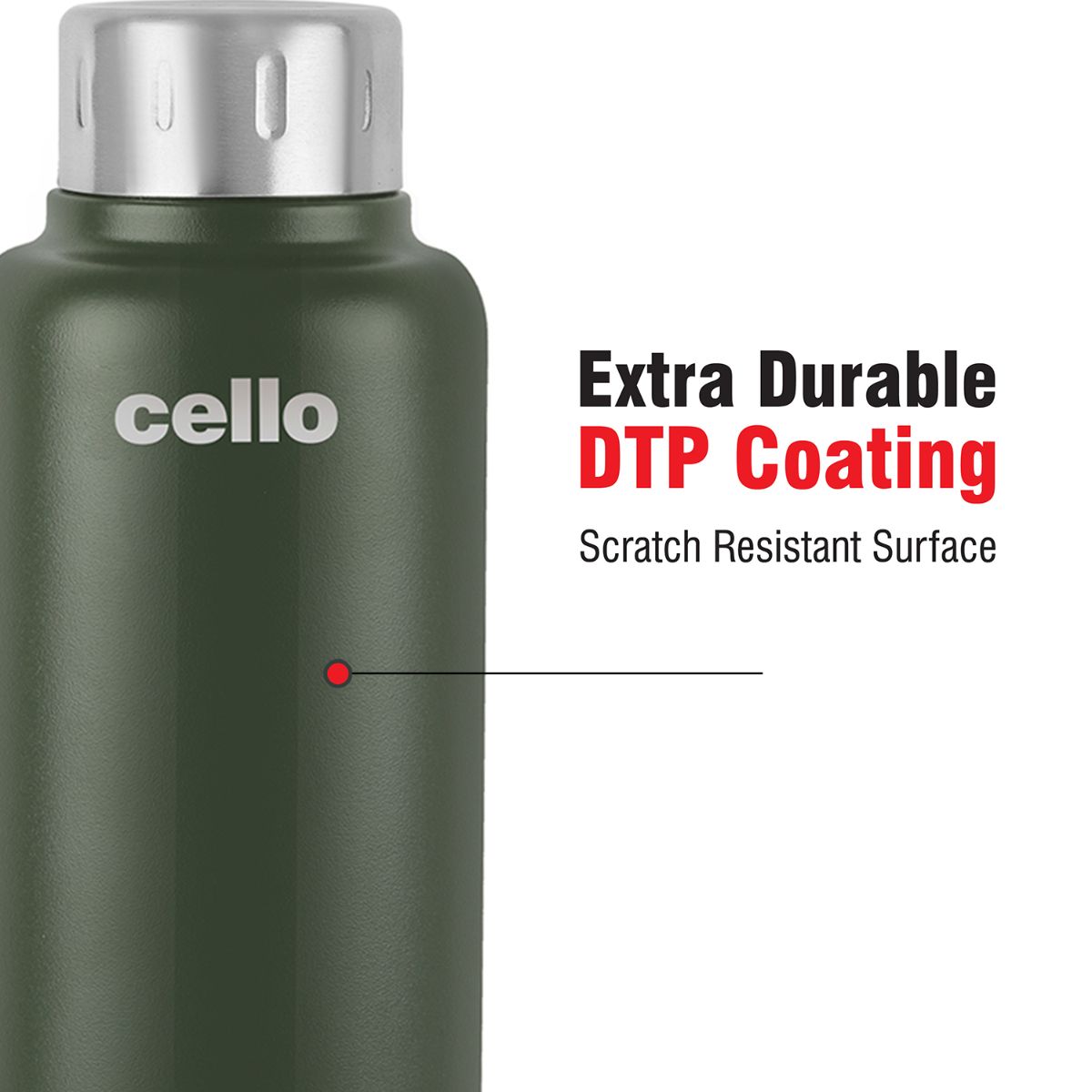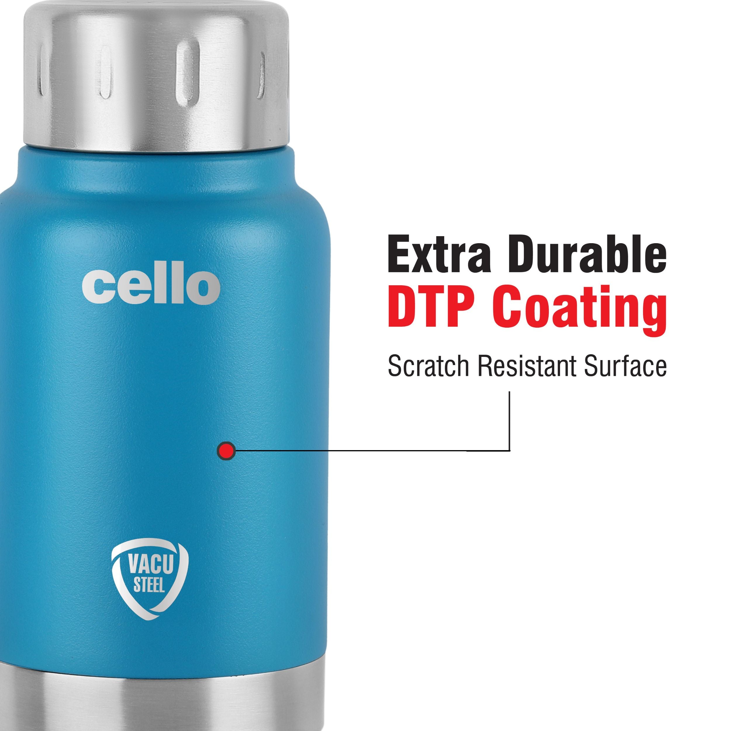 - The Duro Top Flask is a compact 750ml stainless steel Vacusteel Water Bottle by Cello, designed for an active lifestyle. Part of the Duro Series, it’s your ideal companion for treks, hikes, cycling, gym sessions, school, or office activities.