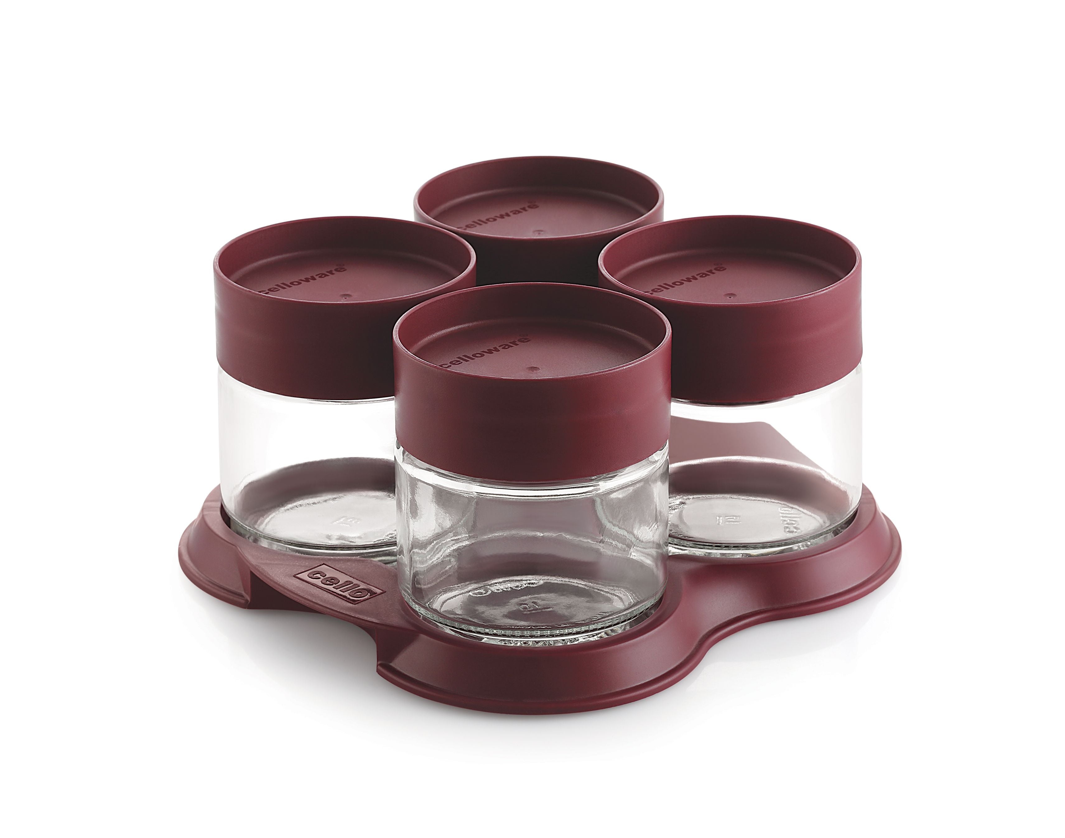 - The Cello Modustack Glassy Tray Gift Set includes five pieces in blue and maroon, featuring four airtight glass jars with a coordinating tray