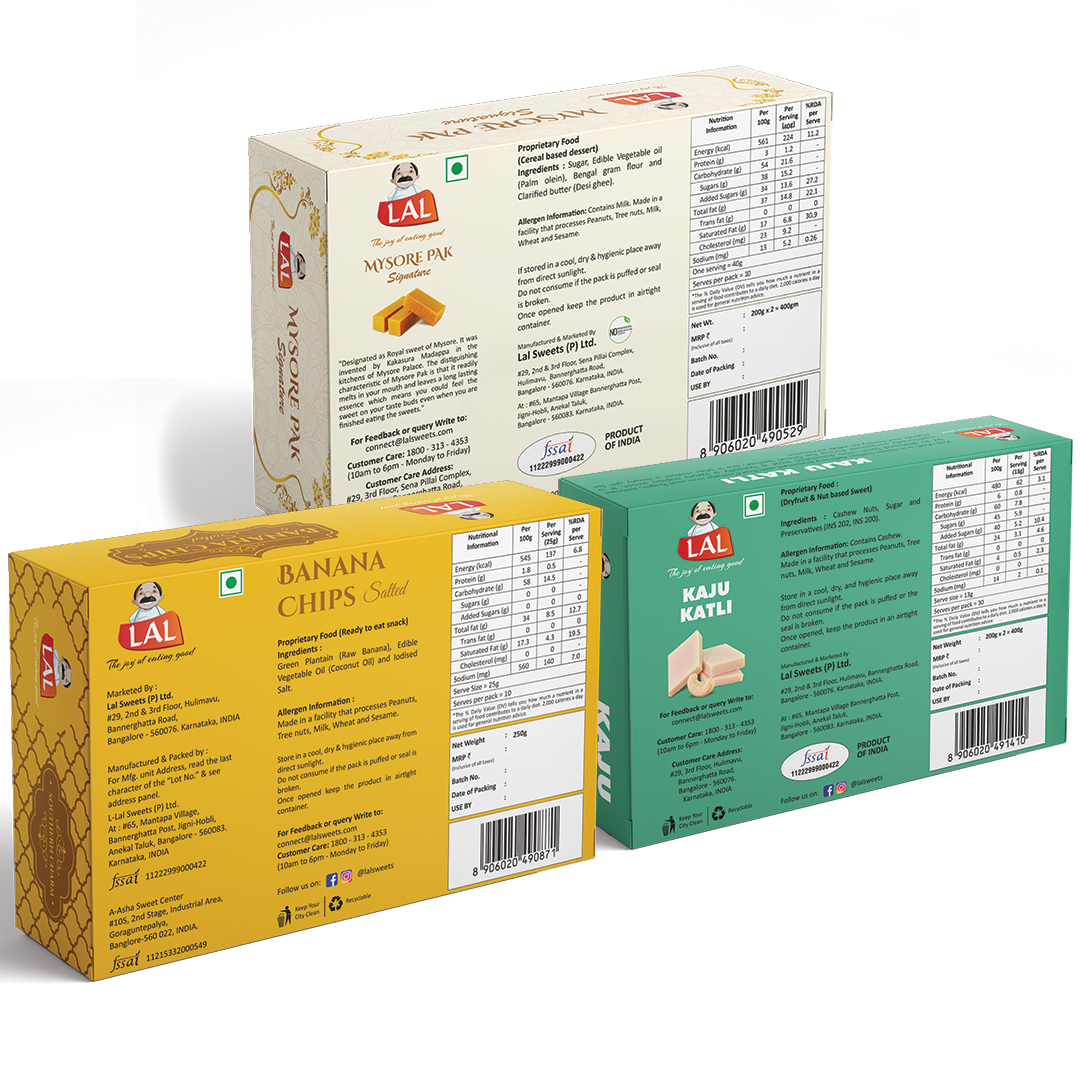Mysore pak signature 400g, Banana chips salted 250g and Kaju katli 400g