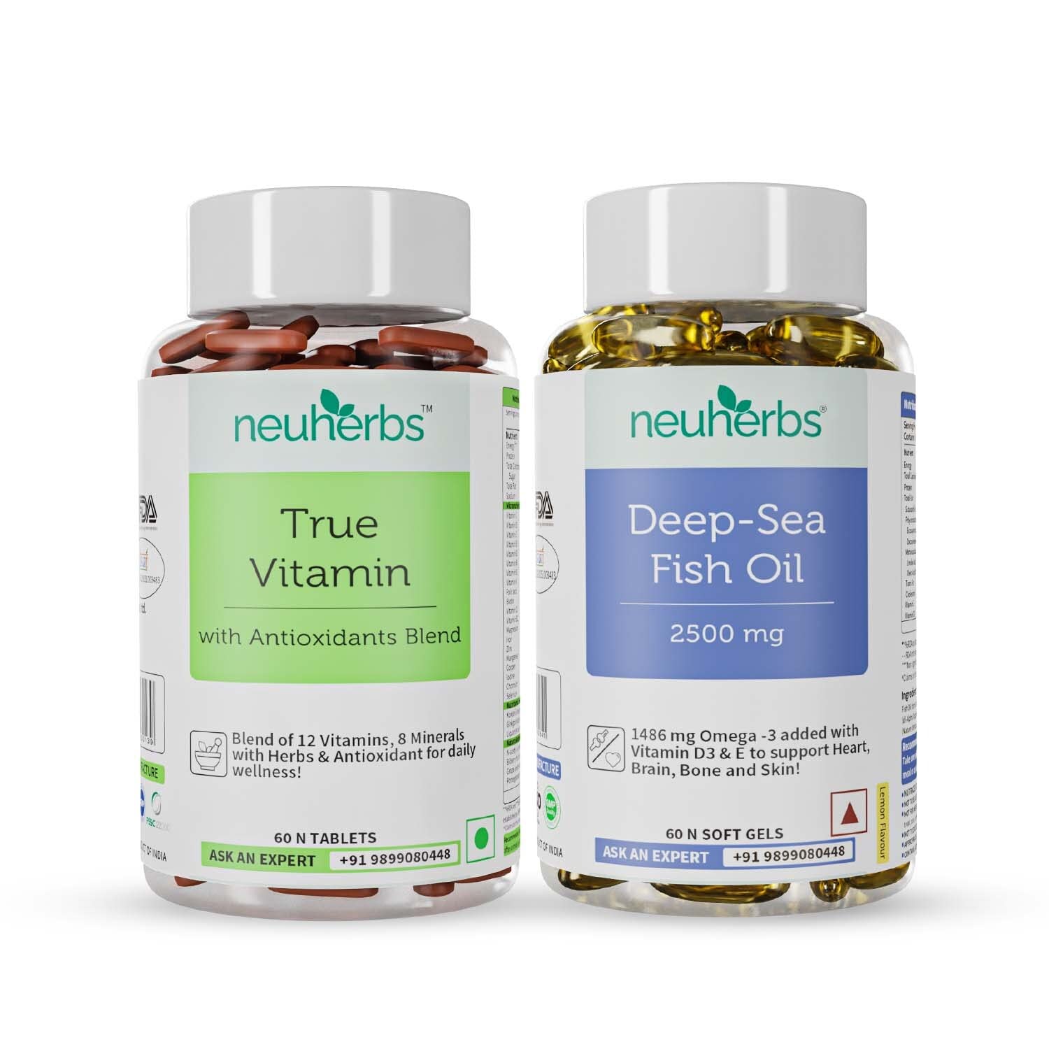 Neuherbs Daily Vitamin Supplement Combo- Multivitamin with zinc, Iodine and vitamin c + Omega-3 Fish Oil Capsules (Deep sea fish oil 2500 mg) : 60 Units each