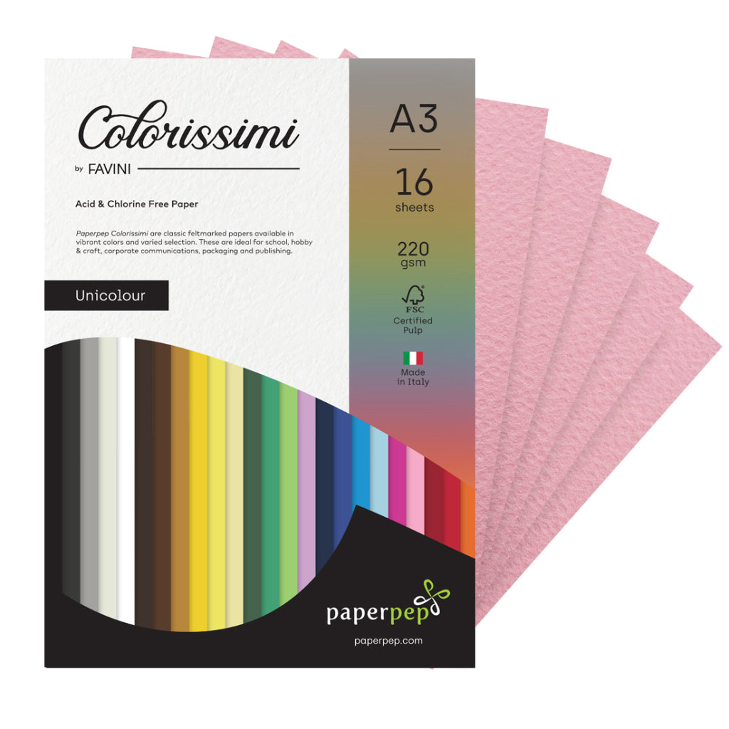 Paper Pep Colorissimi is a high quality coloured in the pulp, 220 gsm paper. It is acid free and therefore very long lasting. There is a marked difference in the surface finish between the two sides. One side is a delicate felt-marked surface, which provides excellent grip for pastels, charcoal etc, the other side is smooth. Produced with FSC certified pulps from responsibly managed forests that are respectful of environmental, social and economic standards. The broad range of 27 colours, from delicate pastel shades to strong, bright colours makes Paper Pep Colorissimi ideal for various applications such as display and presentation, paper construction, collage, pastel and charcoal paintings, coloured pencils, pen and ink, origami, report covers etc. Ideal for different techniques, from scrapbooking, cardmaking, or running through your die cutting and embossing machine to create embellishments for scrapbook layouts, tags, gift bags, and a whole lot more, make them the perfect and complete range for both students and artists. Create something amazing, cut out wonderful shapes and just let your imagination go bonkers! Due to its thickness and texture, it should be tested on one sheet before printing, but nevertheless it is suitable for both inkjet and laser printing. Paper Pep Colorissimi is available in four sizes: A5, A4, 4 x 6 Inch . Made in Italy.