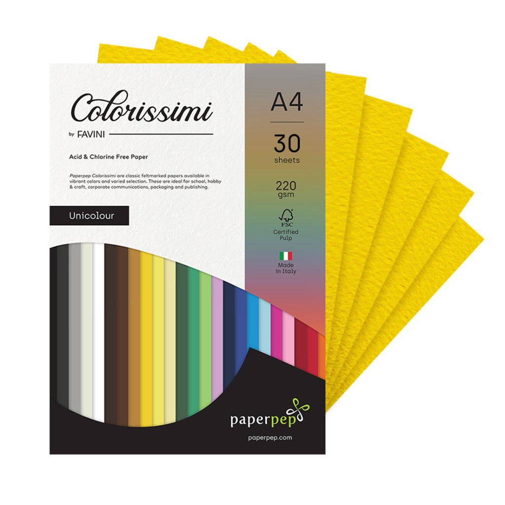 Paper Pep Colorissimi is a high quality coloured in the pulp, 220 gsm paper. It is acid free and therefore very long lasting. There is a marked difference in the surface finish between the two sides. One side is a delicate felt-marked surface, which provides excellent grip for pastels, charcoal etc, the other side is smooth. Produced with FSC certified pulps from responsibly managed forests that are respectful of environmental, social and economic standards. The broad range of 27 colours, from delicate pastel shades to strong, bright colours makes Paper Pep Colorissimi ideal for various applications such as display and presentation, paper construction, collage, pastel and charcoal paintings, coloured pencils, pen and ink, origami, report covers etc. Ideal for different techniques, from scrapbooking, cardmaking, or running through your die cutting and embossing machine to create embellishments for scrapbook layouts, tags, gift bags, and a whole lot more, make them the perfect and complete range for both students and artists. Create something amazing, cut out wonderful shapes and just let your imagination go bonkers! Due to its thickness and texture, it should be tested on one sheet before printing, but nevertheless it is suitable for both inkjet and laser printing. Paper Pep Colorissimi is available in four sizes: A5, A4, 4 x 6 Inch . Made in Italy.