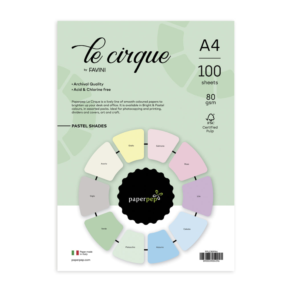 Paper Pep Le Cirque is a high quality coloured produced using only selected pulps harvested in well-managed forests, 80gsm paper. It is acid & chorine free and therefore very long lasting. Produced with FSC certified pulps from responsibly managed forests that are respectful of environmental, social and economic standards. Wide range of 20 colours, from delicate pastel shades to strong, bright colours with smooth surface makes Paper Pep Le Cirque ideal for various applications such as photocopying & printing, display & presentation, paper construction, collage, origami, report dividers & covers, art & craft etc. Ideal for different techniques, from scrapbooking, cardmaking, or running through your die cutting and embossing machine to create embellishments for scrapbook layouts, and a whole lot more, make them the perfect and complete range for both students and artists. Create something amazing, cut out wonderful shapes and just let your imagination go bonkers! It is suitable for both inkjet and laser printing. Paper Pep Le Cirque is available in A4 size in different assortments. Papers are made in Italy.