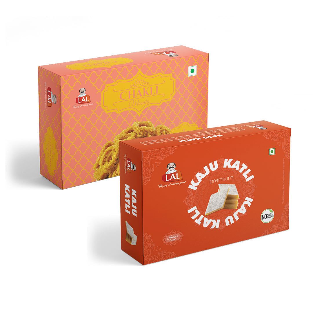The subtle spiciness of Palak Chakli is perfectly balanced by the smooth, nutty flavor of Premium Kaju Katli, offering a harmonious snack duo.
