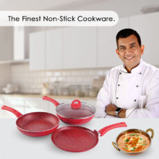 Granite Non-stick Cookware Set, 4Pc (Frying Pan With Lid, Wok, Dosa Tawa), Induction Bottom, Pure Grade Aluminium, PFOA, 3.5mm, 2 Years Warranty, Red