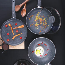 Granite Non-stick Cookware Set, 4Pc (Fry Pan with Lid, Wok, Dosa Tawa), Induction Bottom, Soft-touch Handles, Virgin Grade Aluminium, PFOA/Heavy metals free, 3.5mm, 2 years warranty, Grey
