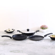 Platinum Plus Non-Stick Cookware Set of 4 | Kadhai with Glass Lid 24cm, Fry Pan 24cm & Dosa Tawa 25cm | Cool-Touch Bakelite Handle | Pure Grade Aluminium | PFOA Free | 1 Year Warranty | Black